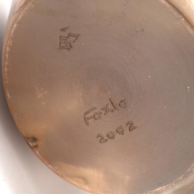 California, the Foxlo piece has a matte glaze, 2002 (13 1/4 in.) and the Rosas piece has an iridescent Raku glaze, 1999 (12 3/4 in.), both signed on the underside.