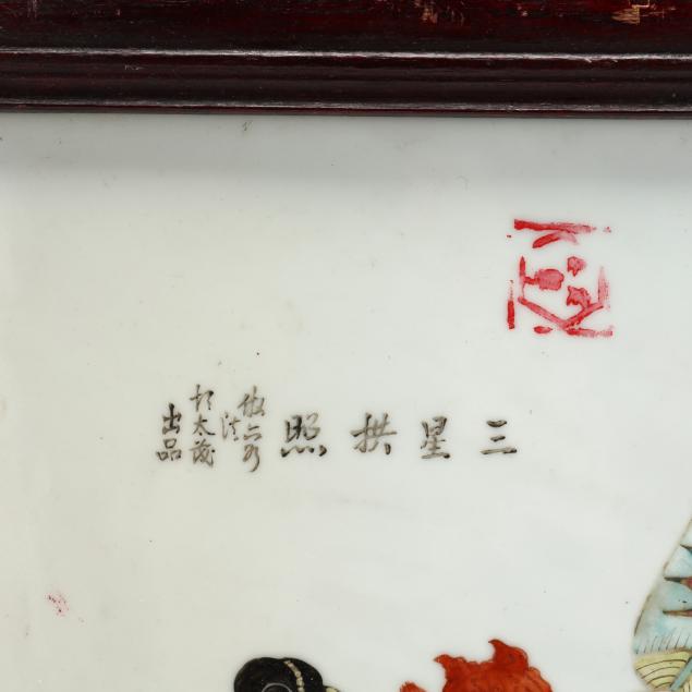 Late 19th century, porcelain plaque hand painted in famille rose palette with the gods Fu, Lu, and Shou, the personified ideas of Prosperity (Fu), Status (Lu), and Longevity (Shou) in the Chinese tradition, together they represent good luck and fortune, they are presented here wearing billowing robes and holding their recognized attributes, titled and signed to the upper left, two illegible export seals stamped in red to upper section, plaque framed in wood with shaped metal style hanger at top.