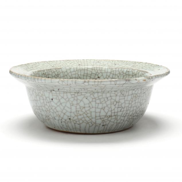 20th century, light gray ground with large crackle to glaze, unglazed foot with glazed medallion in the center having an eight character inscription.