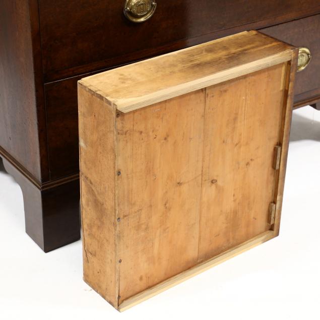 Later pulls covering plug hole; no key; later trim to top; case with some small veneer patches and shrinkage cracks; later feet; missing right side rear foot facing.
