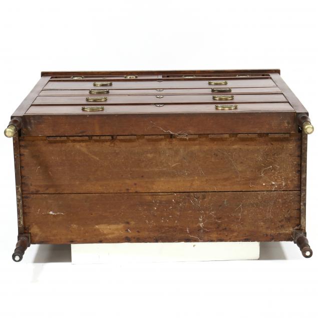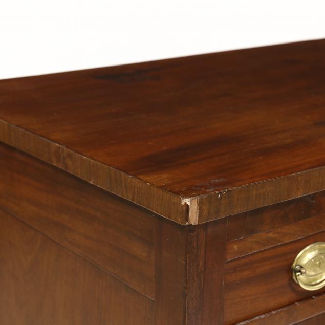 Circa 1820-1840, mahogany veneer, poplar secondary, vertically veneered edge and frieze, two small side-by-side drawers over a deep banded edge drawer over three flush drawers, paneled sides, turned and tapered legs with brass ball feet.