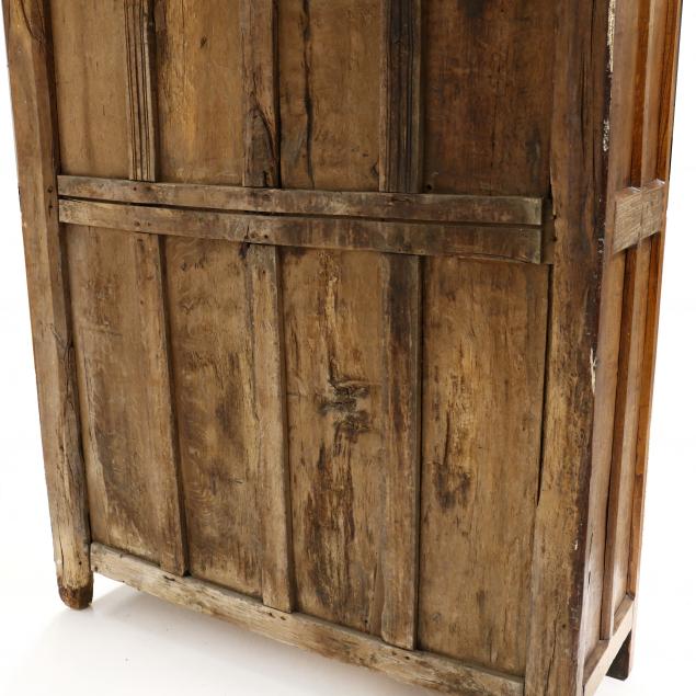 Late 17th / early 18th century, one part form, top with molded edge, four pin-hinged relief carved linen fold doors, shelved interior, each side with four panels, beveled frame, straight feet from the solid.