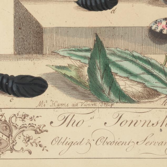 Hand-colored engravings, 18th century, each retains gallery label to verso, presented in painted wooden frames with foliate and butterfly decoration.