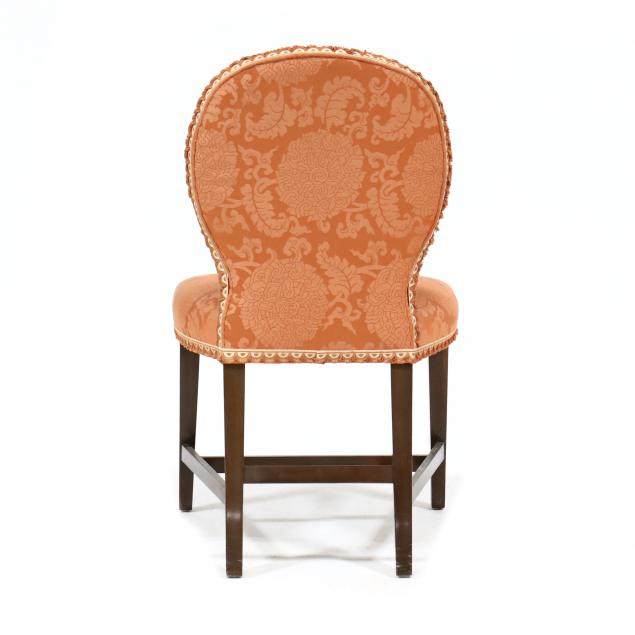Consisting of a pair of circa 1800 chairs and eight later custom matching chairs, balloon backs and serpentine seats with salmon damask upholstery, front tapered legs with scratch bead, rear down-swept legs, stretcher base, unmarked.