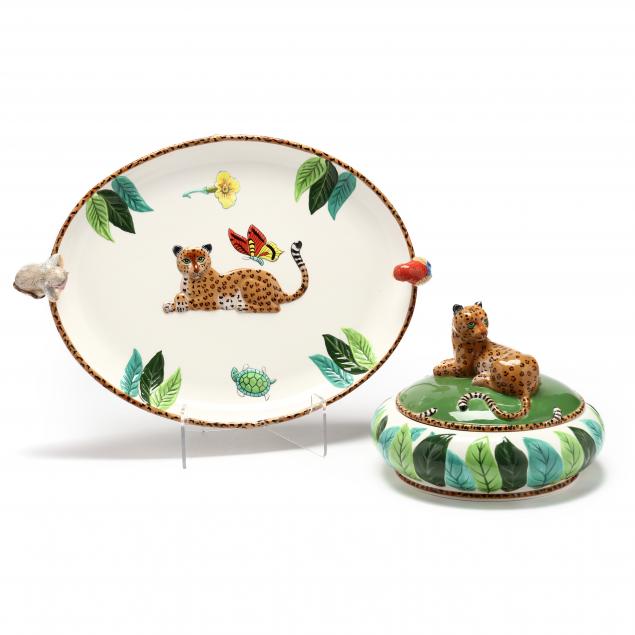 Each decorated with leaves in shades of green and jungle wildlife, the tureen features a full bodied jaguar finial (DOA 8 1/2 x 11 in.) both dated 2006.