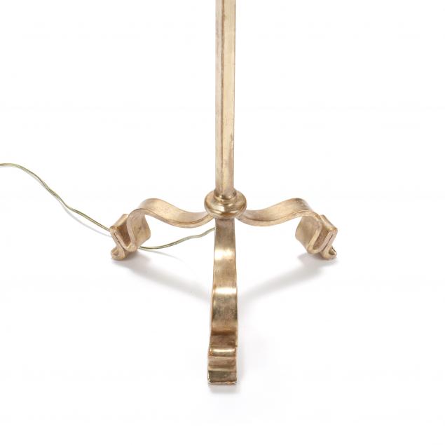 Late 20th century, double light form with a pleated shade, silver leaf metal standard on a scrolled tripod base, unmarked.