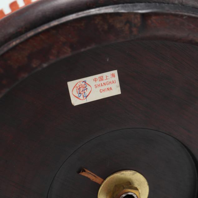 lingzhi, drilled and set into a hardwood base, with single lightbulb fixture, comes together with a shade.