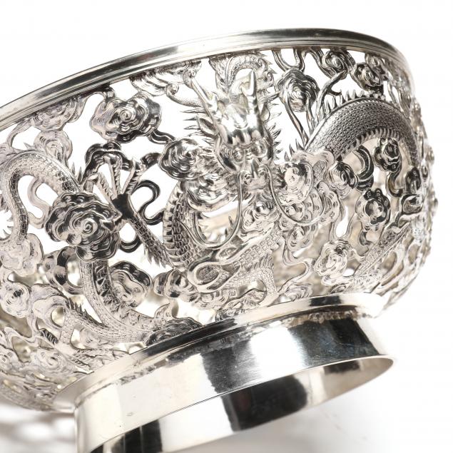Qing dynasty, circa 1900, with ornate cutwork design of dragons chasing a flaming pearl amidst roiling