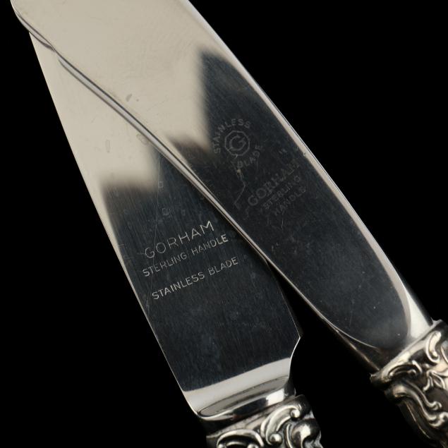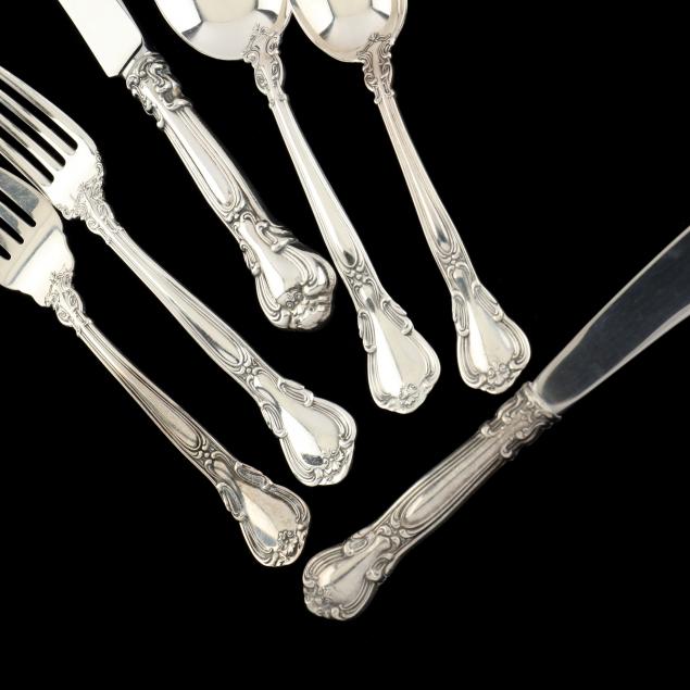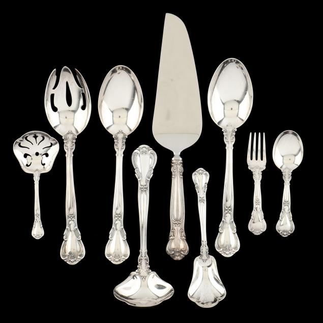 (52) pieces, service for eight, including: (8) knives (8 7/8 in.); (8) forks (7 in.); (8) salad forks; (8) cream soup spoons; (8) teaspoons; two-piece baby set; master butter knife; pie / cake server; gravy ladle; bon bon scoop; sugar shell; (4) tablespoons; pierced tablespoon. No monograms.