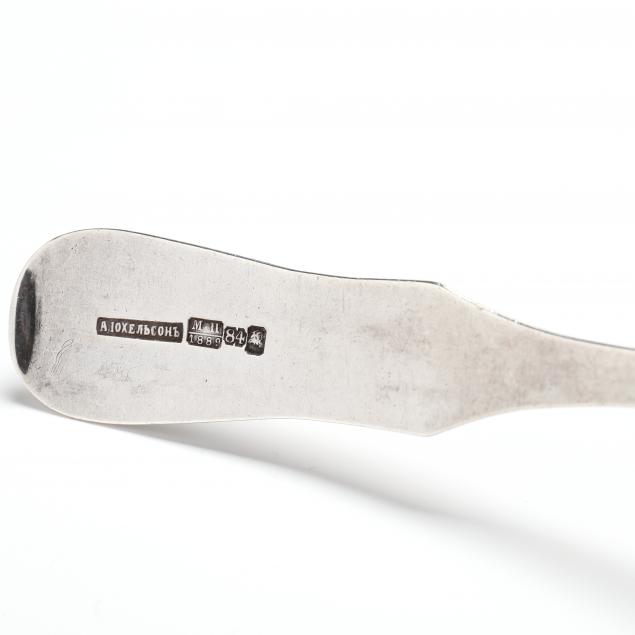 First a .875 silver tablespoon with Cyrillic maker's mark, 1889 assay master Mikhail Aleksandrovich Pereselgi, 84 zolotniki (.875) mark, Moscow city mark (8 7/8 in.); and a silverplate goblet with filigree designs, unmarked (5 1/4 x 3 x 3 in.). Both without monograms.
