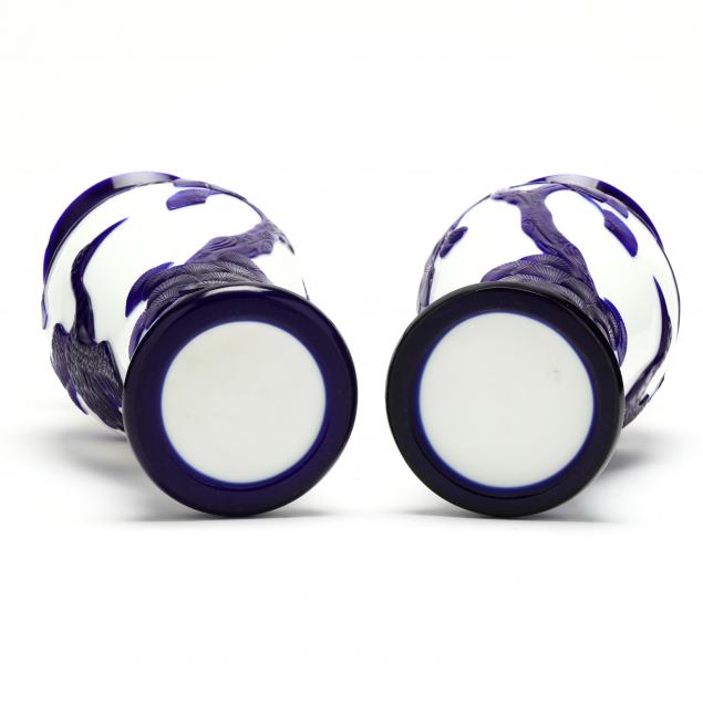 Early 20th century, a pair of mirrored creamy white Peking glass vases with sapphire blue carved decoration of cranes and pine trees.