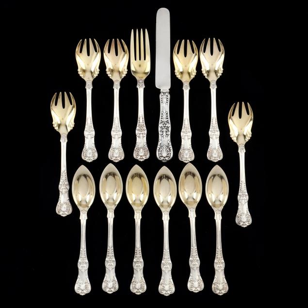 (14) pieces including: (6) parcel gilt fruit spoons, no monograms (5 3/4 in.); (6) parcel gilt ice cream forks, no monograms (5 1/2 in.); and a youth knife with sterling blade and parcel gilt fork, both with period script monogram "RLR" and the knife engraved "1898."