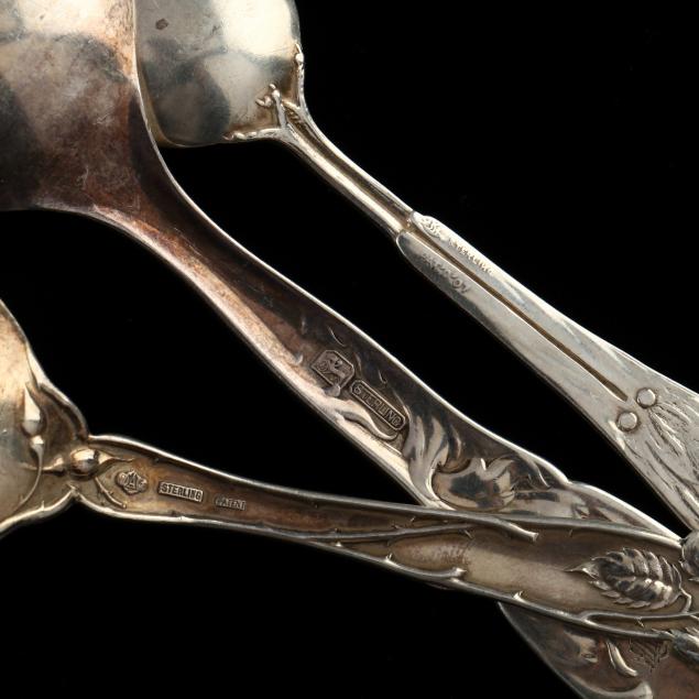 Bridal Rose tablespoon, with monogram; Arthur Stone salad serving fork and spoon, no monogram (9 1/4 in.); Gorham sugar tongs, no monogram (4 1/4 in.); (4) Tiffany & Co. leaf straw stirrers, no monogram (8 1/2 in.); Manchester
