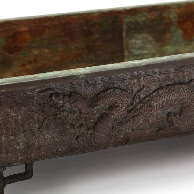 Edo period (1868-1912), early 19th century, bronze rectangular tray form raised on four bamboo branch style feet, two bamboo style handles flank the short sides, three claw dragons are cast in relief to the two long sides, ground has archaic decoration