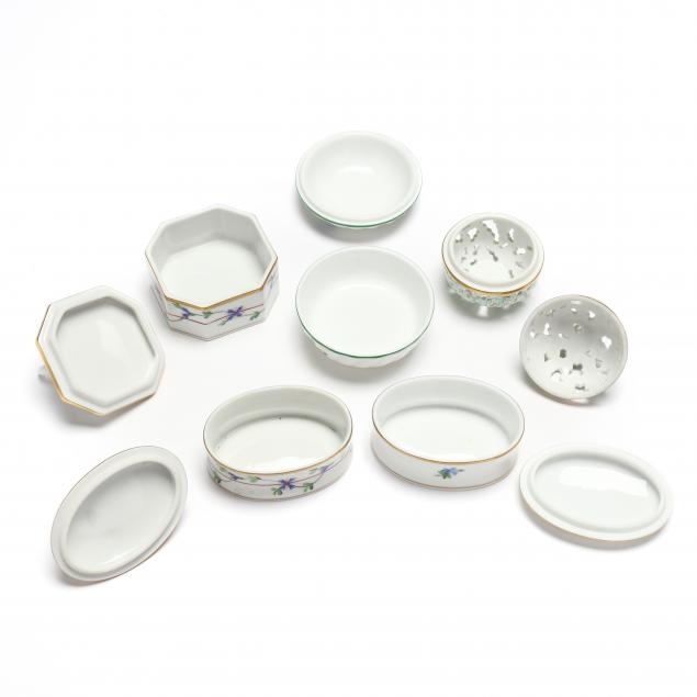An octagonal box with cat finial; a round box painted with flowers; two lozenge shaped Cat box 2 3/4 in.)boxes one with rose finial; a round reticulated box.
