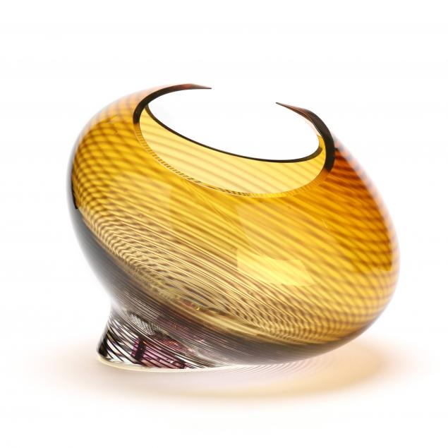 2000, thin blown amber swirled glass with polished pointed rim, tilted base, signed.