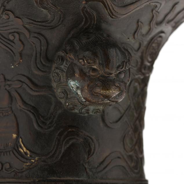 19th century or earlier, a bulbous shaped vase with wide neck and mouth, finely cast with detailed auspicious motifs such as