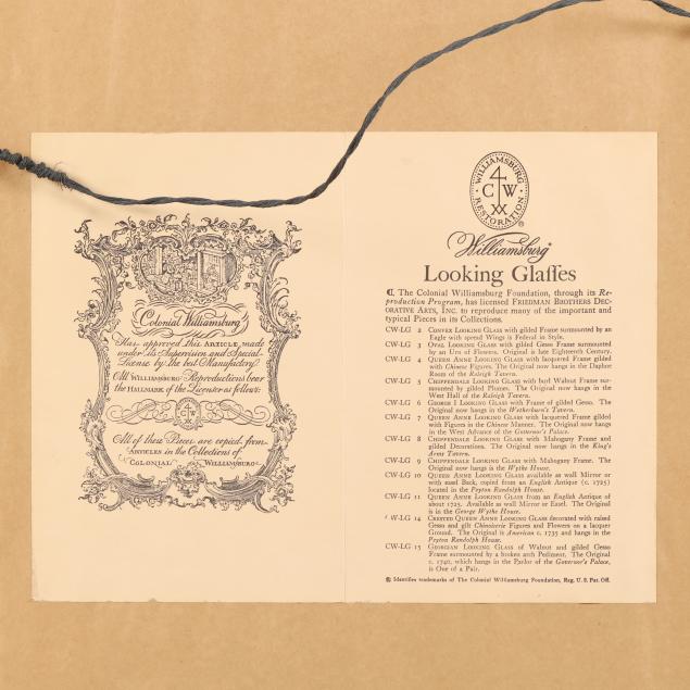 Second half 20th century, eagle head and shell pediment, scrolled ears and floral pendant apron, with beveled rectangular mirror, labeled to verso with Colonial Williamsburg stamp.