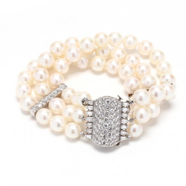 The three strand bracelet strung knotted with (51) round white cultured pearls (8mm average) and with two gold spacer bars bead set with full cut round diamonds, completed with a shaped white gold clasp pavè set with full and single cut round diamonds and further set with baguette cut diamonds framing the clasp, with safety chain and fold safety catch. Full and single cut diamonds weigh approximately 2.75 total carats (F-G color, VS2-SI1 clarity); baguette cut diamonds weigh approximately .75 total carats (F-G color, VS2-SI1 clarity). Total weight approximately 3.50 carats.