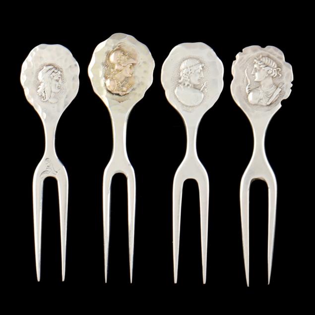 One marked for "Sterling and 14K," with period incised monogram to verso; three additionally marked with the Galt & Bro. of Washington, D.C. retailer's mark, two with period monograms, the third without monogram.