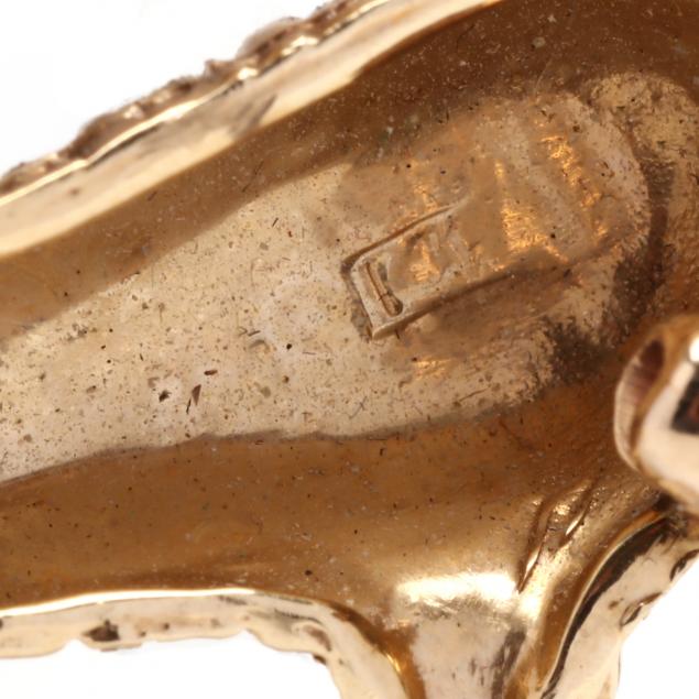 The whimsical zebra with polished and textured gold body, with bezel set round cut rubies, completed with a single locking pin stem, stamped 14K.