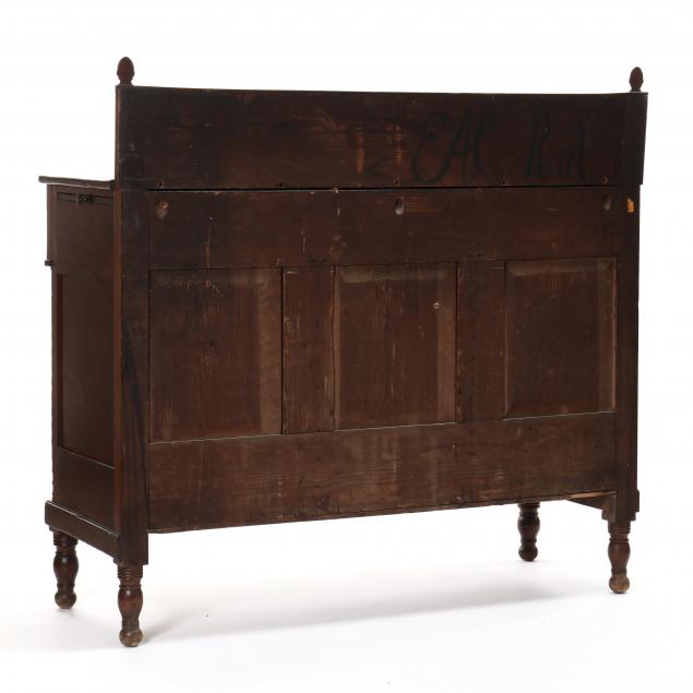 Attributed to Wake County, circa 1830, mahogany veneer, yellow pine and poplar secondary, backsplash featuring book-matched figured burl veneers with spiral twist stiles and acorn finial, top with vertically grained veneer convex edge, three side-by-side upper projecting drawers above three paneled recessed cabinet doors, the center cabinet featuring two vertical divided bottle drawers, reeded center stiles, applied spiral twist half-column stiles, paneled sides, left and right side with pull-out slide, raised on tall ring turned distinctive legs with ball foot.