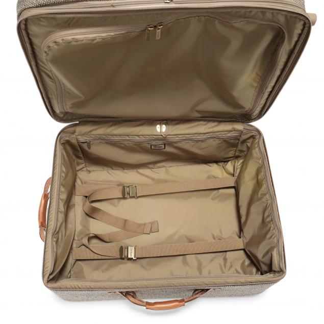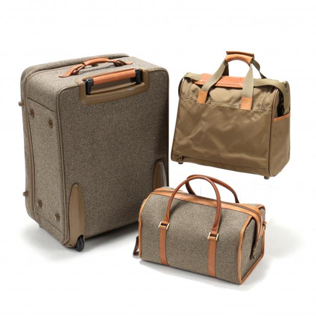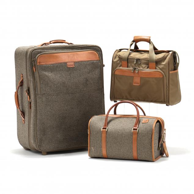 The Legend Medium Journey case, nylon tweed and leather with internal frame, telescoping handle, 2 inch expansion capability and spinner wheels (24 x 18 x 12 in) (overall good pre-owned condition).; a tweed and leather cosmetic case with plastic lined interior and elastic and for three bottles (9 3/4 x 15 x 9 in.) (toning and water stains to leather); a back pack of olive green nylon with web straps, leather trim, several outside compartments (12 x 15 x 9 in.) (some interior soiling).