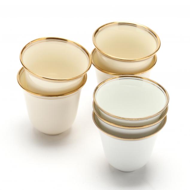 Mark of Barbour Silver Co., pattern number 1319/68, all with engraved urn garland motif, including (12) sterling demitasse frames and saucers, along with (16) cream white and gilt porcelain inserts (most by Lenox), without monograms.