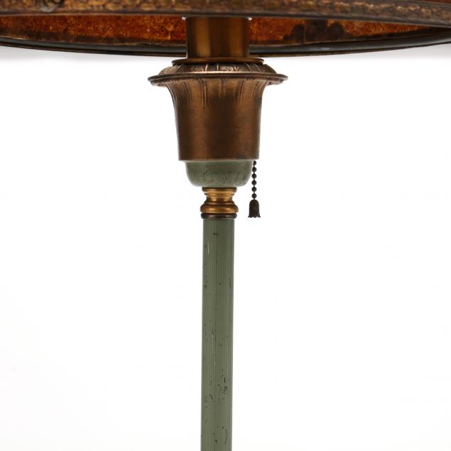 Circa 1920-40, the underside marked "Artistic B. & P.B. WKS...", etched glass cover, mica panel shade with gilt metal mounts, painted metal base.