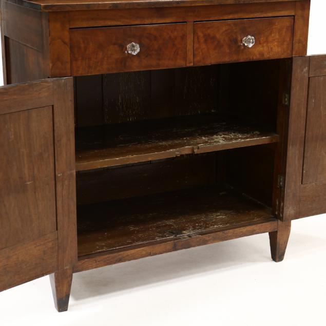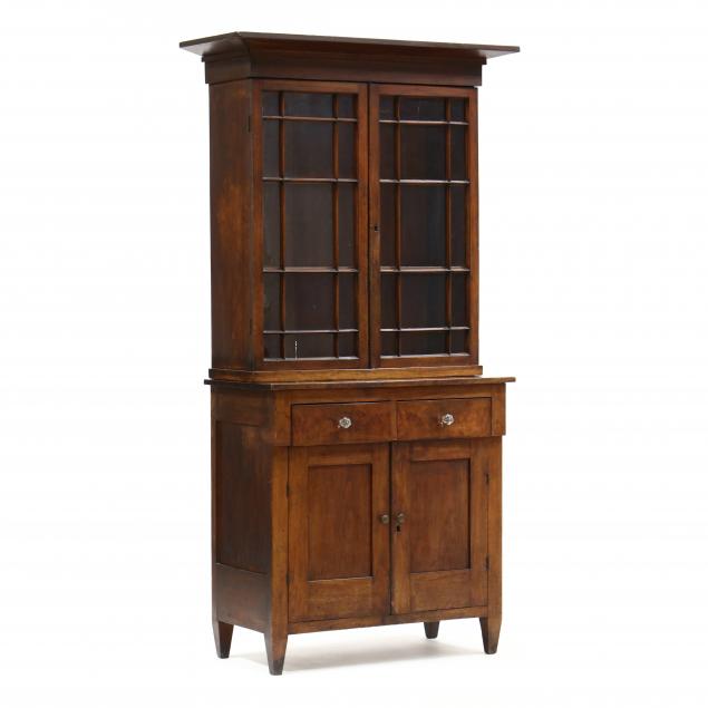 Attributed to Wake County, early 19th century, yellow pine secondary, two part form, applied flared cornice above a plain frieze above two hinged cabinet doors with distinctive window pane design consisting of (15) window panes and molded mullions, shelved interior, the base featuring two side-by-side drawers with high grade burl wood veneer and full dust boards, above two hinged paneled doors with shelved interior, paneled sides, square tapered feet from the stile.