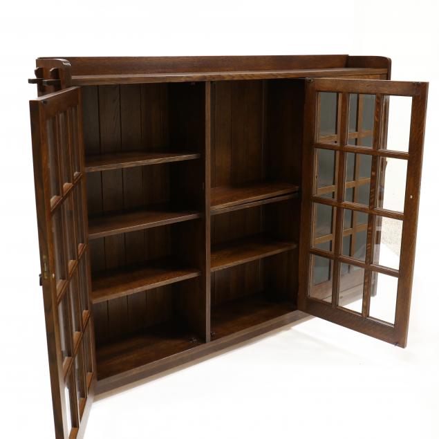 1998, #71, solid quarter sawn oak with through tenon joinery, three hinged doors with twelve glass panes each, divided and shelved interior, labeled to back panel, with two keys.