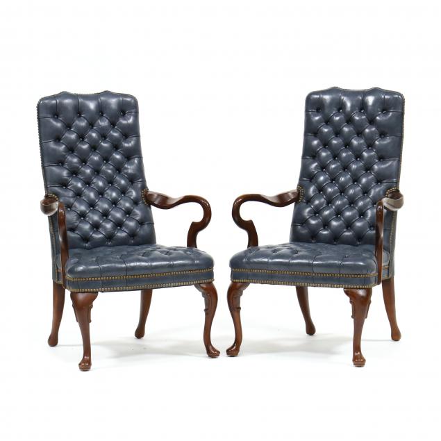 Late 20th century, colonial blue tufted leather with brass nailhead trim, cherry arms and legs, labeled.