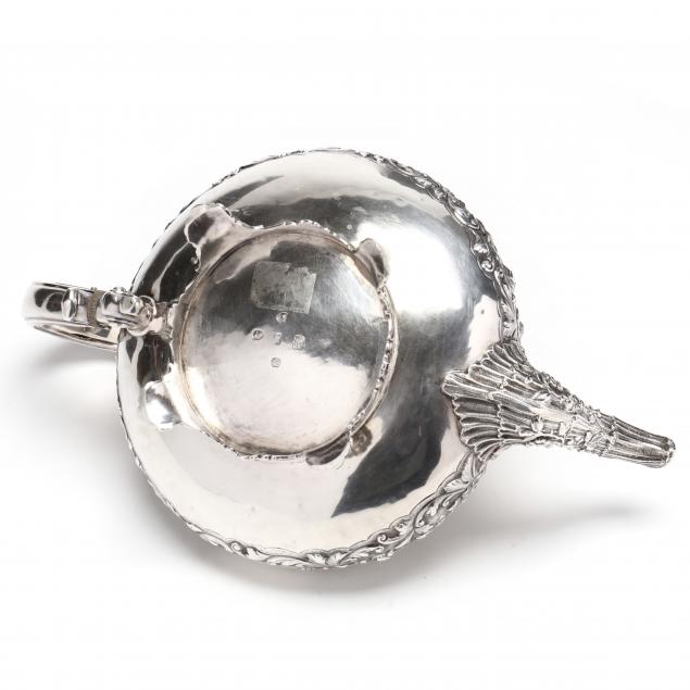 Mark of Joseph Angell I, London (1830), charmingly squat form with ornate chased floral decoration, one cartouche with period "RA" monogram, the opposite cartouche is open, the hinged cover features a petal form edge and a finely cast blossom form finial.