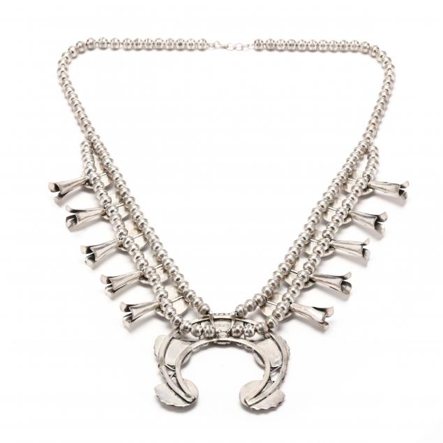 The central naja bezel set with oval pink mother-of-pearl plaques and with scroll and fan motifs and with ten squash blossoms set with oval pink mother-of-pearl plaques and joined to a bead necklace with a hook clasp.