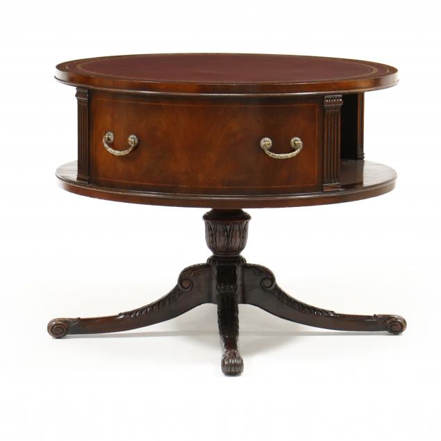 Mid 20th century, rotating circular top with inset maroon tooled leather, two faux drawer panels with banded inlay, open shelf, quadruped base with acanthus leaf carvings.