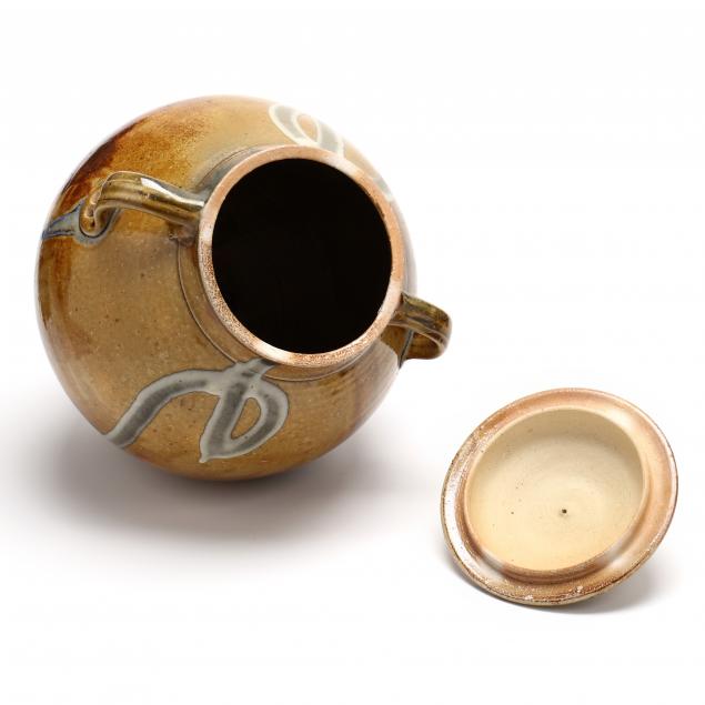 Ash glazed stoneware of an ovoid form with dual strap handles, gently domed lid, decorative slip from the rim and lower handle attachments, signature glyph on the underside.