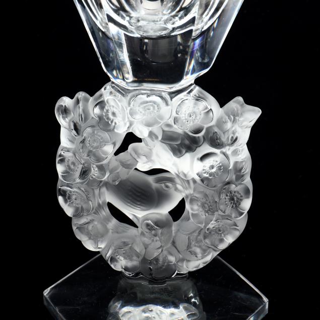 France, clear cut, polished and frosted crystal with a tapered hexagonal vase over a floral wreath with two birds on a hexagonal foot, signed.