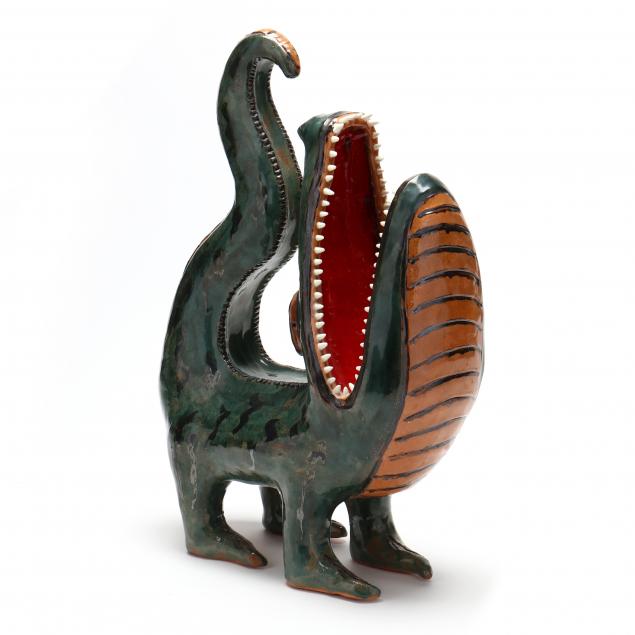 High gloss glazed earthenware, modeled standing with erect tail and wide open mouth displaying rows of sharp white teeth, impressed 'scales' decorate the back, underside marked "BH 49". One of a very limited number made by the potter.