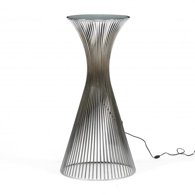 Late 20th century, chrome plated metal with inset frosted glass top, hourglass shape with central interior up-light, faded label to interior.