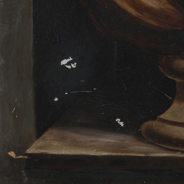 Oil on tin, early 20th century, unsigned, depicting a bust of a Roman senator set within an architectural niche, punched hole to top and bottom of tin sheet, unframed.