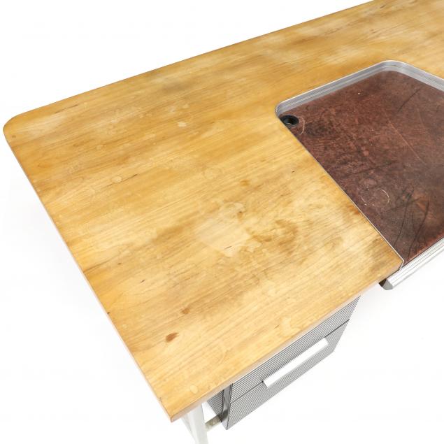 Designed in 1958 for the Gordon Bunshaft Building, birch top with inset leather writing surface, aluminum trim, four drawers, the back with black painted metal grille, unmarked.