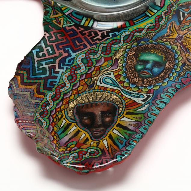 1990, cast glass Africa form with a fused blown glass vase, applied masks and incised decoration with hand painted enamel to verso, signed and dated to back rim of vase.