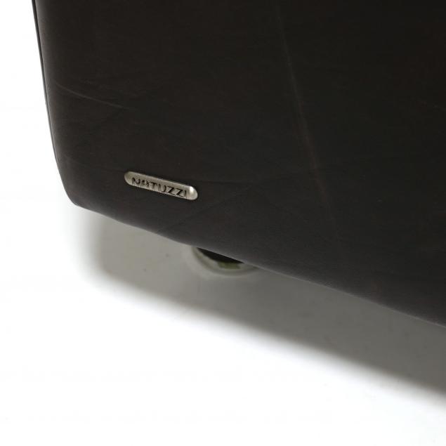 Italy, circa 1999, dark brown leather, zipper attached back cushions with modernist turned wood and metal support bar, two stationary seat cushions, recessed rounded wood legs with silver tone cap feet, labeled.