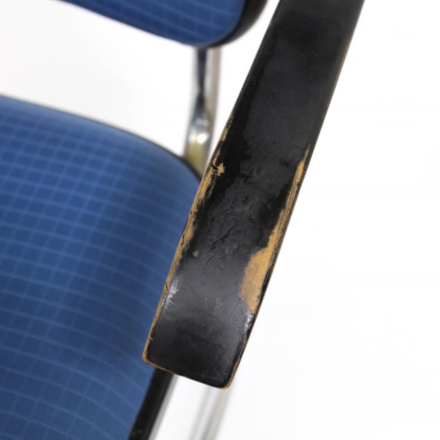 From the Collection of Royall & Company, Richmond, Virginia One chair with separations to blue upholstery at seat; all with wear to black lacquer especially at arms; caning all appears intact.