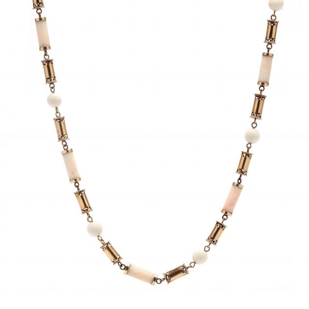 The necklace in an alternating pattern with round (10mm) and cylinder (7mm) angel skin coral beads and with reticulated gold cylinder beads, completed with an integrated barrel clasp with safety catch, testing 14KT.