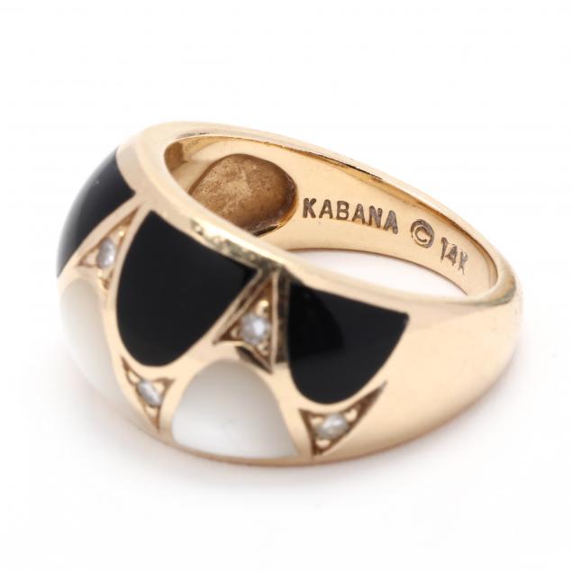 To include a domed gold band inlaid with mother-of-pearl and black onyx and set with full cut round diamond melee weighing approximately .14 total carat (H-I color, SI1-SI2 clarity), signed Kabana (12.8mm; ring size 7); and a crossover inlaid band with mother-of-pearl, turquoise, malachite, lapis, black onyx, agate, and single cut round diamond melee weighing approximately .04 total carat (H-I color, SI clarity), stamped 14K 585 (11.4mm; ring size 7) (missing one diamond melee).