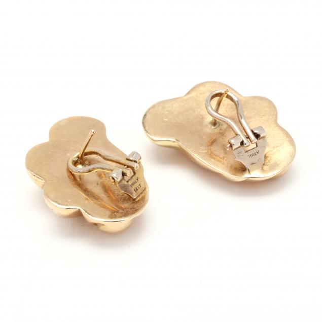To include a pair designed in high polish and textured gold in a knot motif, completed with posts and omega clip backs, stamped 14K Italy (13/16 in.); a pair in a swirled fan motif completed with posts and omega clip backs, stamped 14K / Italy (1.25 in.) (posts slightly misshapen); and a pair in a bombè melon motif with black enamel highlights, completed with posts and omega clip backs stamped CIG / 14K (15/16 in.) (with enamel loss).