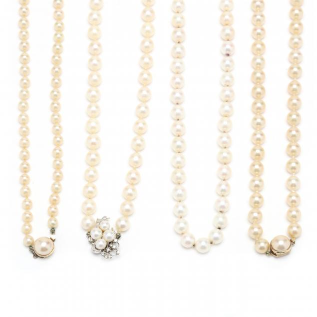 A single strand necklace strung knotted with round cultured pearls (7.7mm average) and completed with a white gold clasp with a pearl cluster and diamond accents, stamped 14K (20 in.); a single strand necklace strung knotted with (46) round white cultured pearls and completed with a yellow gold barrel clasp stamped 14K (17 in.); and two faux pearl necklaces (29 in.; 26.25 in.).