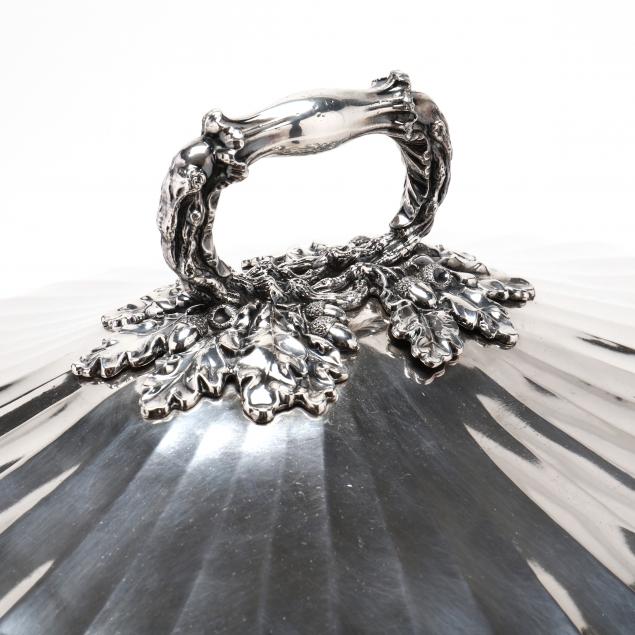 Early 20th century, with fluted dome body above a cast floral motif band, acorn and oak branch ring handle, obverse engraved with heraldic crest and Latin banner "Hactenus Invictus," otherwise without monogram.