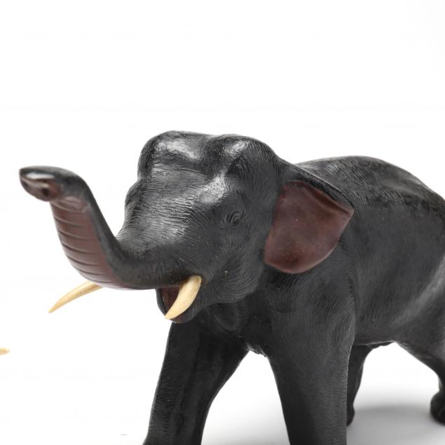 Meiji period (1868-1912), very well cast bronze elephant sculptures, the inside of the ears with reddish brown patinated, includes a smaller elephant with three character maker's seal to its underside belly and a larger elephant, both with ivory tusks, one tusk can be removed on smaller elephant, the other appears glued to sculpture, the larger elephant has two ivory tusks, both can be removed.